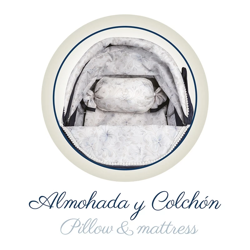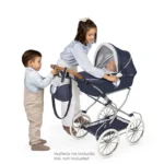 Περιλαμβάνει: 1 μπλε και άσπρο vintage καρότσι για κούκλες με πτυσσόμενο πλαίσιο, κάτω δίσκο, μεγάλες ρόδες με επένδυση αφρού, ρυθμιζόμενο ύψος τιμονιού, μαξιλάρι, στρώμα, ανάρτηση, εντατήρες οροφής, ασορτί τσάντα και πολλές άλλες πολυτελείς λεπτομέρειες.
